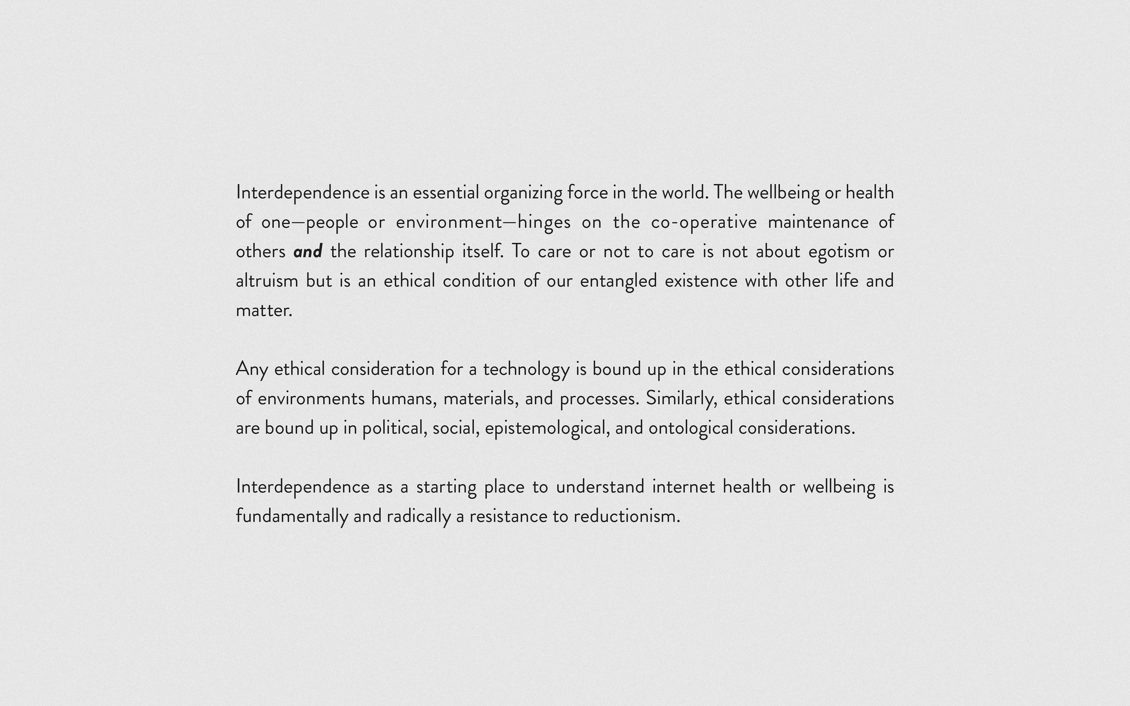 How can care ethics help internet health advocacy work incorporate more ecological stakeholders and have a broader view of home and participation? How can care ethics help reframe internet health issues such as: Digital inclusion, Decentralization, Openness, and Web literacy? By using an ecofeminist ethic of care to understand internet health I hope to spark new ideas, new focuses, re-frame existing ideas, and extend and explore internet health advocacy from an ethical standpoint which considers humans and matter together.